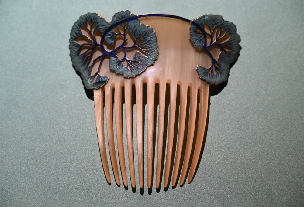 Ещё одна вещь из мастерской Рене Лалика – гребень с растительным орнаментом, оплетающим верхушку. Ар-нуво – это прихотливые очертания и устремлённость к природным формам – лианам, плющу, вьюнкам. То был эскапизм, вызванный страхом перед грядущей цивилизацией машин.