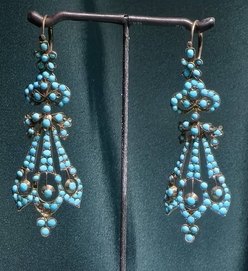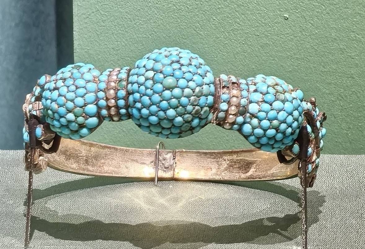 Бирюза – совсем иные флюиды. Она и простовата, и надменна – смотря, как её подать. Бывает она и опасной. «Девушке нельзя дарить бирюзы, потому что бирюза, по понятиям персов, есть кости людей, умерших от любви, а замужним дамам нельзя дарить аметиста», - говорится у Николая Лескова в рассказе «Жемчужное ожерелье». Тем не менее, бирюза слыла «девичьим» камешком, так как идеально сочеталась со свежестью барышень. Перед нами – бирюзовые браслеты, броши – в виде цветов и птиц, длинные серьги. А если всё это в сочетании с голубыми глазами, которые тогда встречались чаще, нежели теперь? «Казалося, для нежной страсти / Она родилась. А глаза… / Ну, что такое бирюза?» - вопрошал Михаил Лермонтов, расписывая тамбовскую казначейшу.