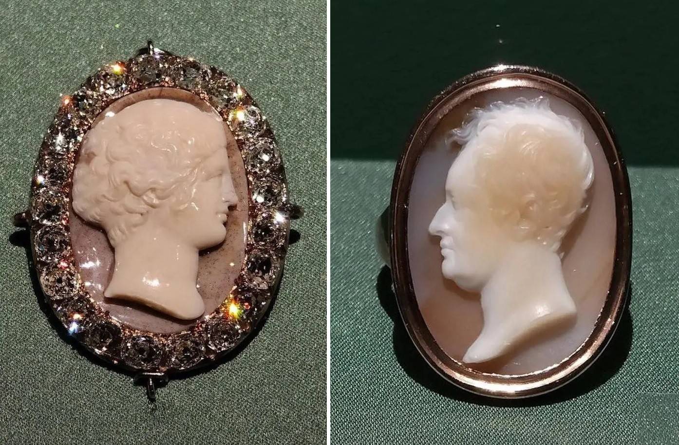 Дивные вещи – свидетельства эпох. Камеи, широко представленные на выставке, сделались популярными в самом конце XVIII столетия, когда началось увлечение древностями, а женские наряды стали похожи на одеяния греко-римских богинь. На протяжении всего следующего века мода на камеи то проходила, то возникала вновь. «Подобного профиля и очертанья лица трудно было где-нибудь отыскать, разве только на античных камеях», - в этой гоголевской фразе – утончённый восторг. На выставке есть и одиночные камеи-броши, и серьги, и массивные ожерелья из камей. На экспозиционных витринах – камеи с изображением Екатерины Великой, Александра I, Иоганна Вольфганга фон Гёте. Также камеями украшались гребни, использовавшиеся дамами для причёсок a-la grecque. На выставке можно увидеть подобные изделия, как отечественного, так и французского производства.