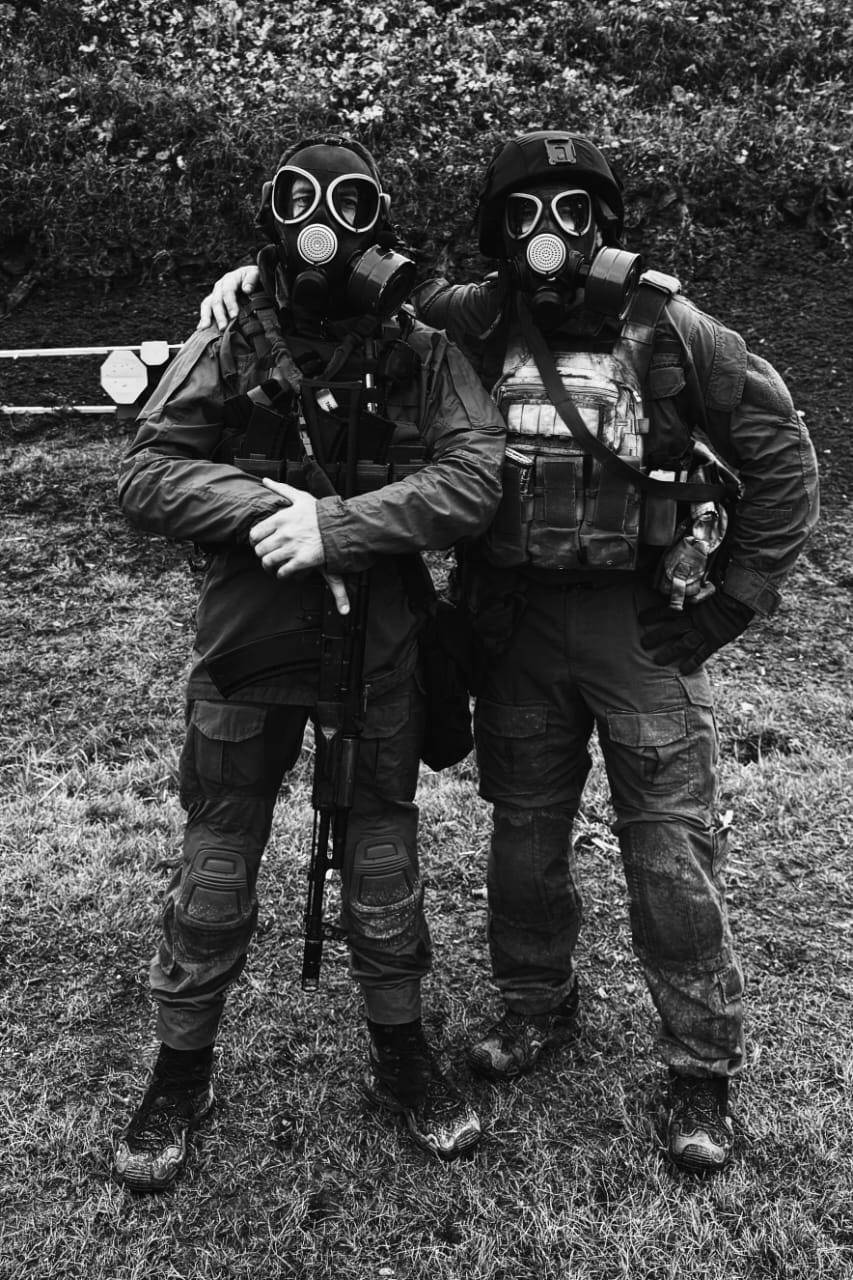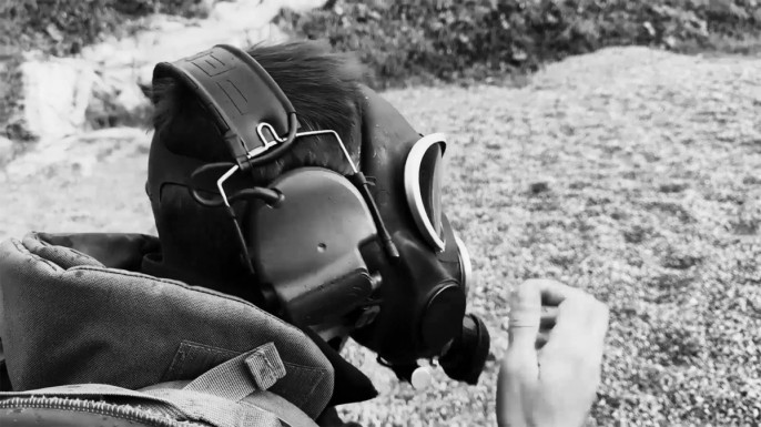 Мы получили современные противогазы в серых чехлах, сверили комплектность, после чего пришло время испытать их в более серьёзных условиях. Мы проверили маски на обтюрацию, заткнув ладонью «банку» фильтра. Потом наш взвод переместился к палатке, куда нагнетали газ.