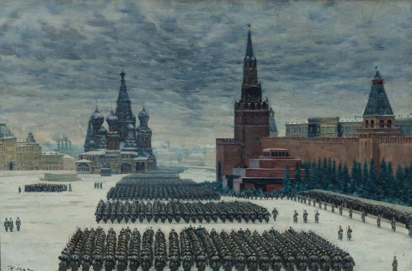 В годы Великой Отечественной войны Константин Юон создал мрачно-патетическую картину "Парад на Красной площади 7 ноября 1941 года". Серый цвет — преобладает. Натянутые нервы. Тотальная решимость. В тот год зима началась рано, стоял кромешный холод. Армейские колонны прямо с парада отправлялись на битву — линия фронта находилась близко к Москве, а фрицы полагали, что Рождество будут справлять в Кремле. Юон, как и все столичные жители, остро переживал события осени 1941 года — общество пребывало в лихорадке, переходя от страха к надежде, от хаоса к стойкому хладнокровию. Наши всё равно победят! Гитлеру не видать Москвы! Юоновское полотно дышит вселенским безмолвием, как будто всё застыло в ожидании мощного рывка.