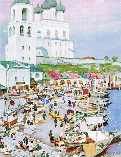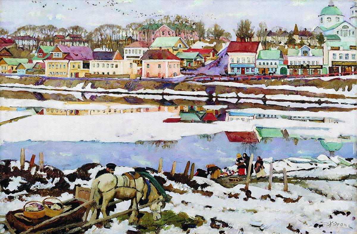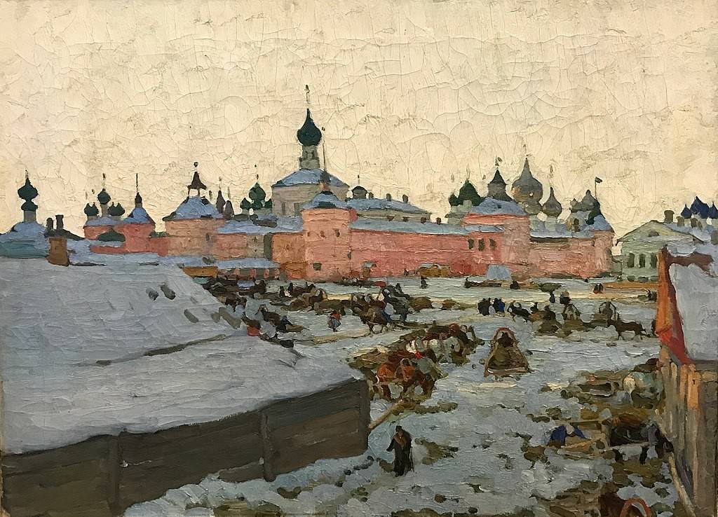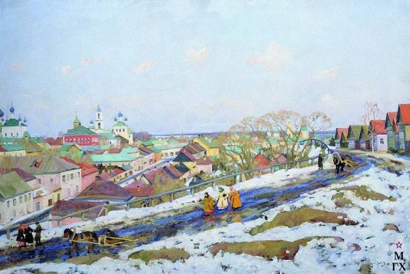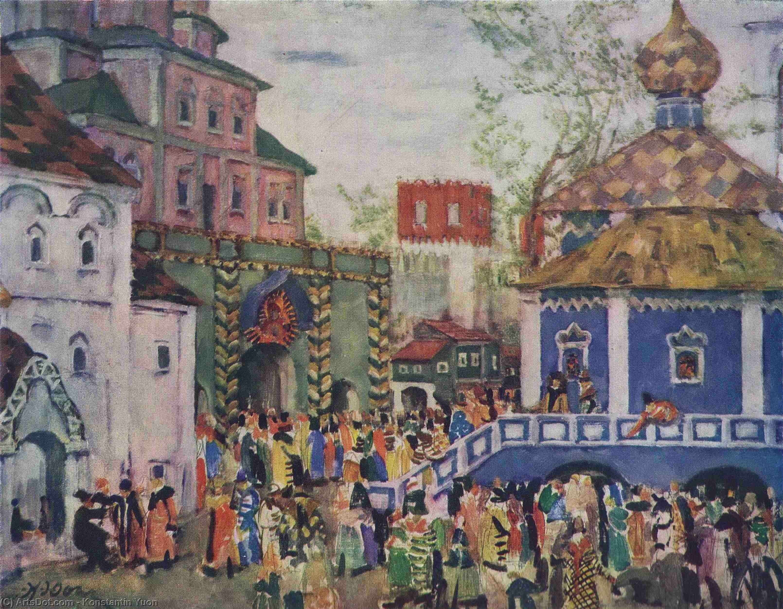 Одним из направлений ар-нуво был как раз неорусский стиль и поклонение допетровской старине — Юон, писавший храмы и кремли, чётко вписывался в концепцию. В те годы поругивали передвижников за их пафосное страдание, выплеснутое на холст. Людские тяготы — это ли надо бесконечно писать? Серебряный век — это ещё и романтизация народа с его вековечной мудростью и близостью к "натуре". Крестьяне и мещане с полотен Юона смотрятся весёлыми да нарядными. Ощущение ярмарочного вихря, шума и гомона.