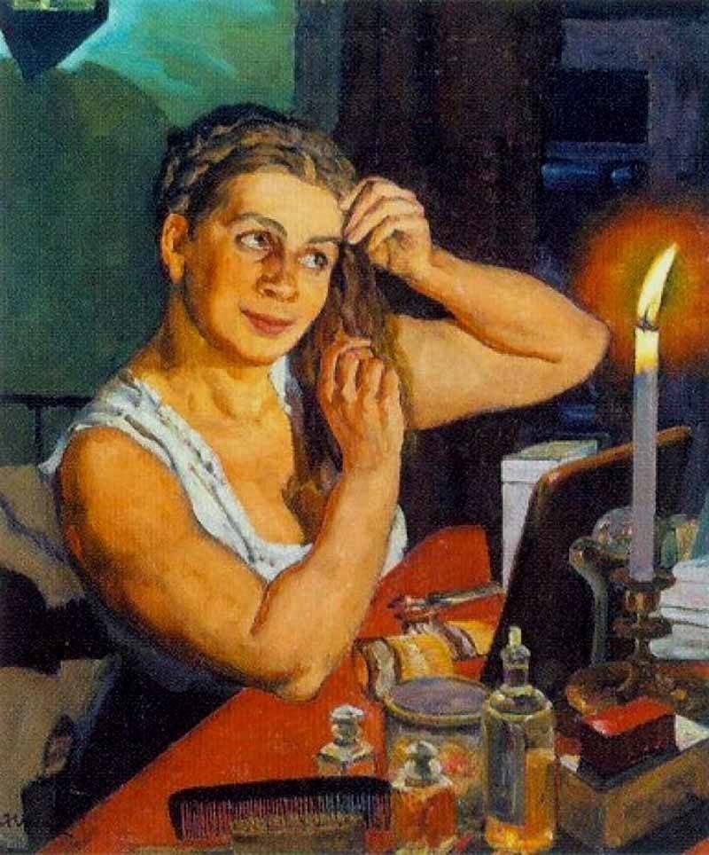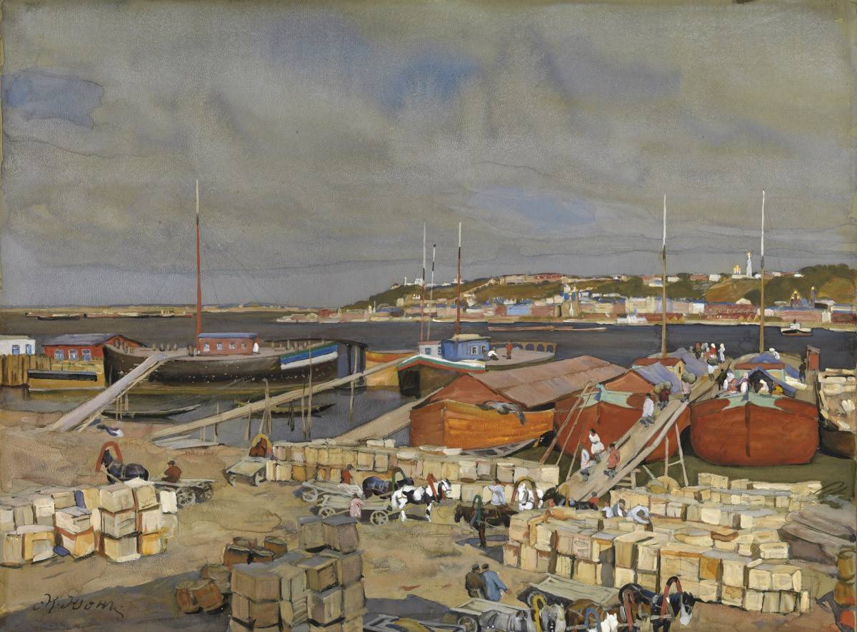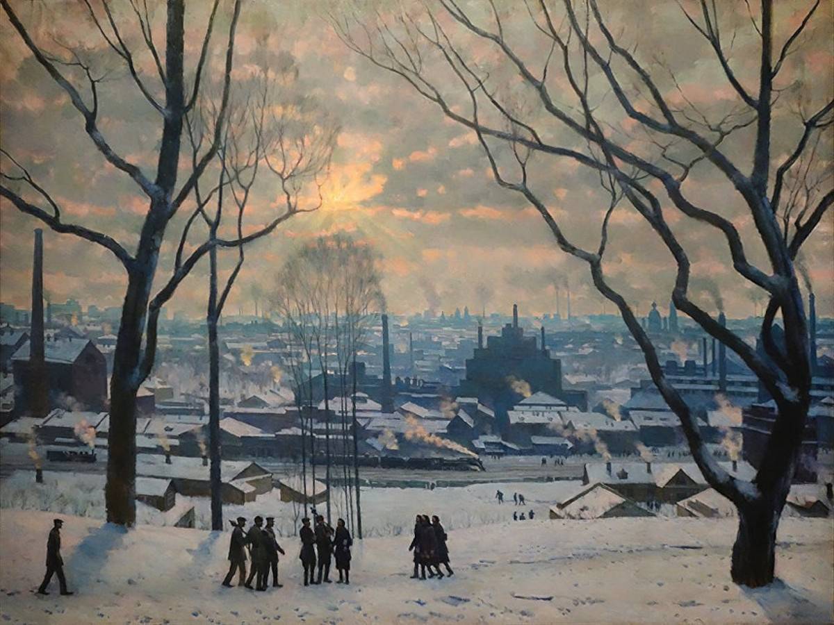 Среди его послевоенных работ особо выделяется "Утро индустриальной Москвы" — мы видим панораму большого города, его заводы, жилые кварталы и отчётливо выписанные церкви. Москва столь грандиозна, что её окраины теряются в рассветной дымке. На переднем плане — группы рабочих. Утро — часы для трудовых свершений, и над всей этой громадой — образ рождающегося светила, которое всегда ассоциируется с каждодневным созиданием.