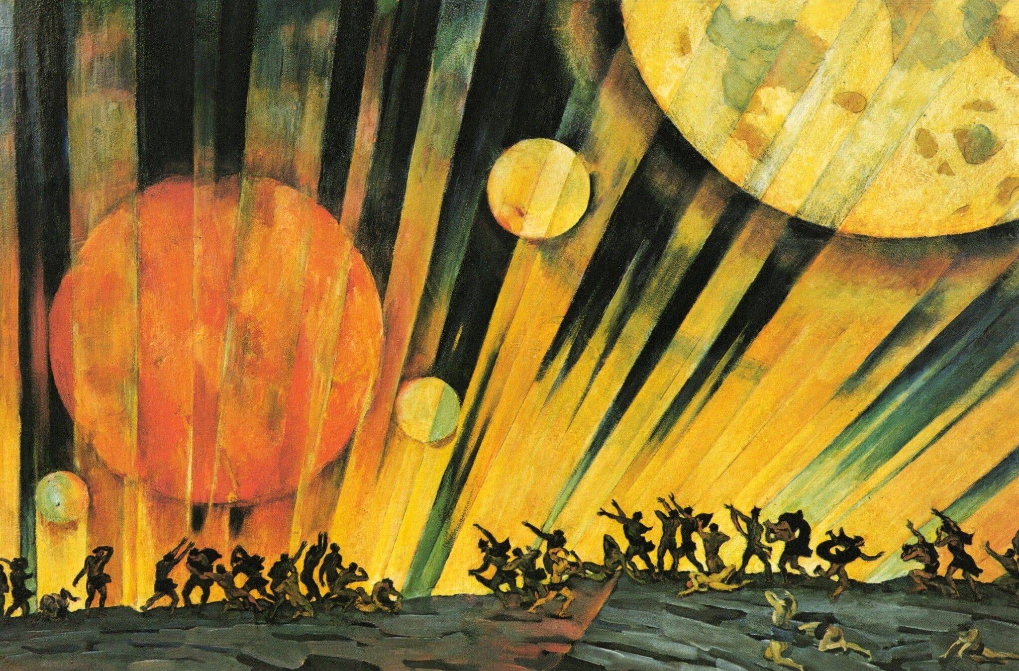 Динамика, смерть и ярость — сирые человечки не знают, как им поступить. Одни — приветствуют алое чудо, простирая к нему руки; иные — бегут прочь, не ведая, куда укрыться. Третьи — умерли, не в силах совладать с горячим дыханием новизны. От этой маленькой — всего 71х101 см — эскизной сиюминутности веет живым и пылким дыханием времени. 1920—1921 годы — столетняя давность, которую не хочется именовать "стариной" — в ней больше движения, чем в нашем столетии.