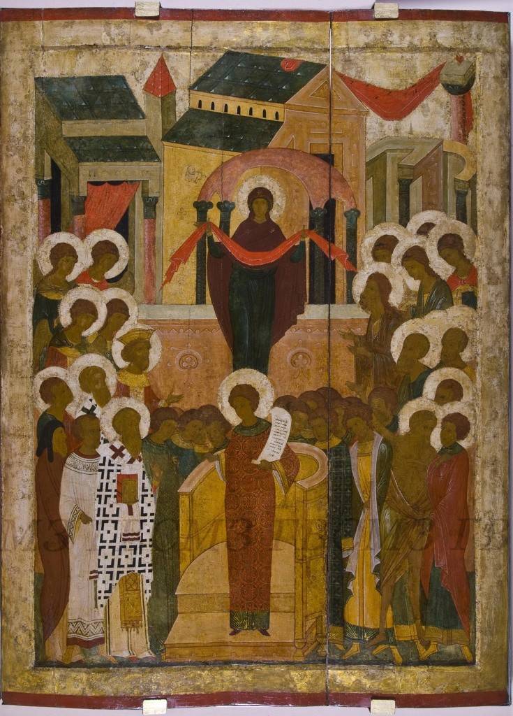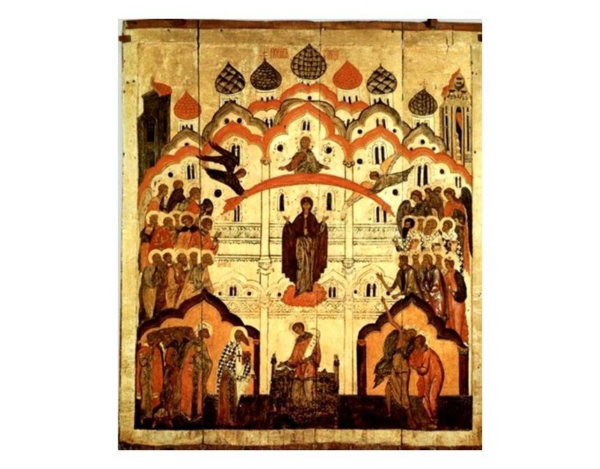 14. Самая ранняя из сохранившихся икон Покрова на дереве – икона 1399 г. из Зверина монастыря (ныне в Государственной Третьяковской галерее).