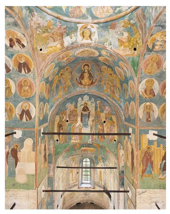 25. Сколь большое значение приобрёл праздник Покрова на Руси, показывает факт размещения его иконы в конхе алтарной апсиды Смоленского собора Новодевичьего монастыря в Москве. Очень красивая и гармоничная по композиции фреска 1598 года.