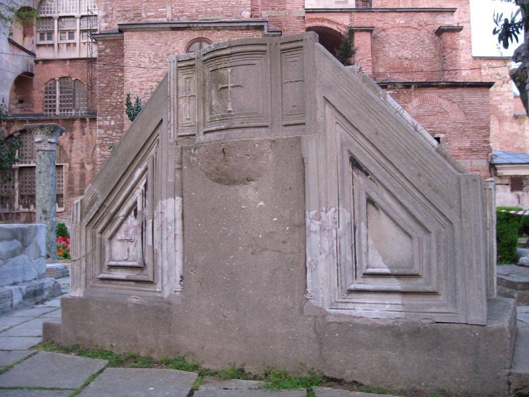 8. Типичный византийский амвон из погибшего монастыря Богородицы Диакониссы стоит теперь во дворе Софийского собора. Примерно такой же мог быть и во Влахернах: если в Большом храме было три апсиды, то амвон очень хорошо встаёт между проходом из капеллы Агиа Сорос и алтарной апсидой, может быть, немного закрывая малую апсиду базилики – диаконник.
