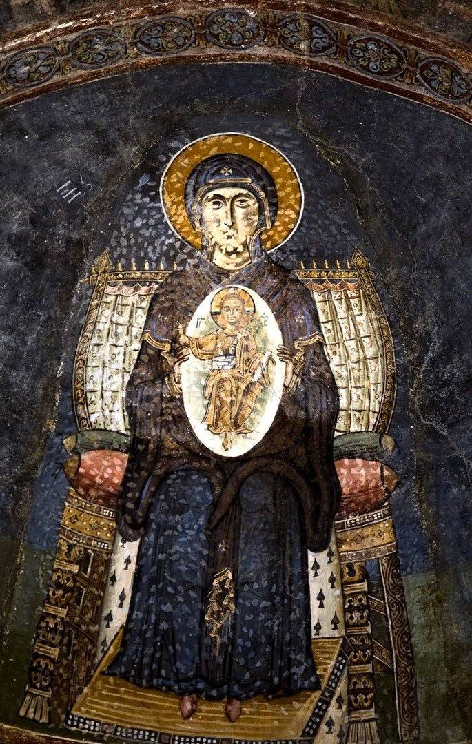 11-12. Богородица Параклисис (на Ней двойной плат-мафорий) и Христос Элеймон (Милостивый). Фрески на алтарных столпах в церкви св. Никиты (село Чучер близ Скопье, Македония) выполнены до . артелью солунских художников Михаила Астрапы.