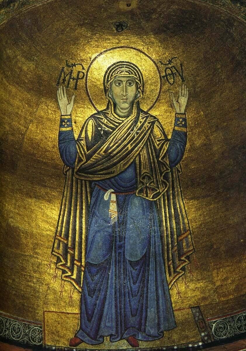 Выходит, дьяк Александр с русской иконой на этот сюжет был знаком. К тому же он использует почти точную формулу величания из службы Покрову, которая в XIV веке на Руси уже была написана, и люди на эту службу ходили. Но где тогда хоть одна византийская икона этого праздника? Не может быть, чтобы все имевшиеся иконы на этот сюжет пропали! И в этом – самая интересная загадка. Скорее всего, русский путешественник дьяк Александр видел другую икону – мозаичный образ Богородицы Оранты в алтарной апсиде Большого храма, который невозможно было выломать и увезти грабителям, – именно с него и писался Её образ на русских иконах Покрова – так, как Её видел святой Андрей.