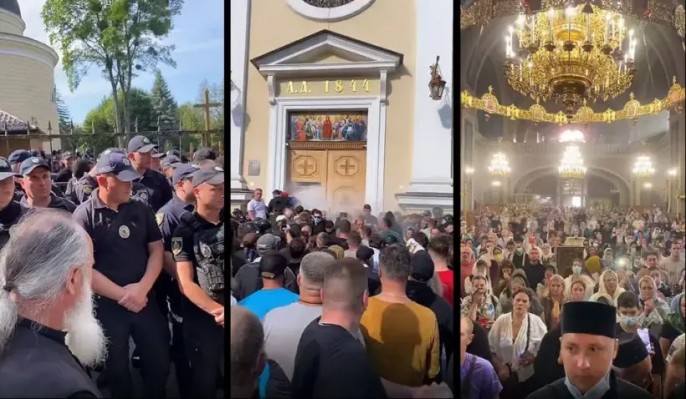 Так, 17 июня была предпринята попытка захвата Свято-Духовского кафедрального собора города Черновцы. В феврале мы уже писали о том, как под забором собора прошло так называемое "собрание религиозной общины" во главе с рейдером от ПЦУ (Православная церковь Украины) Романом Грыщуком, которое, чтобы дважды не вставать, "перевело" в ПЦУ сразу три храма, и среди них — Свято-Духовский собор. Тогда Грыщук верещал, что под забором собралось "проукраинское крыло общины собора, которому московские попы мешают спокойно молиться". Подчеркнём слова Грыщука о "проукраинском крыле", это важно.
