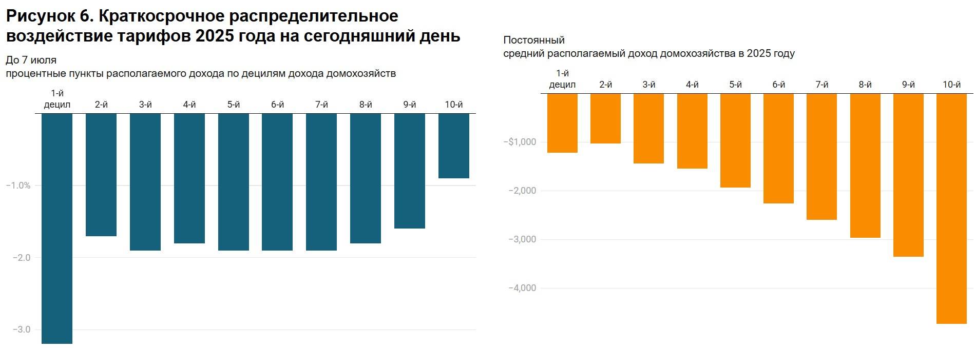 Американские домохозяйства из самого бедного дециля заплатят дополнительно по 1,2 тыс. долл. за год и потеряют 3,2% относительного потребления, а из самого богатого – 4,7 тыс. долл. и 0,9%, медианного – потеряют 2,1 тыс. долл. Американские и ответные пошлины снизят американский ВВП на 0,7%, а американский экспорт – на 15% в 2025 году и на долгосрочную перспективу. ВВП Канады сократится на 2%, ВВП Китая – на 0,2%, Британии – также минус 0,2%, Евросоюза – минус 0,1%.