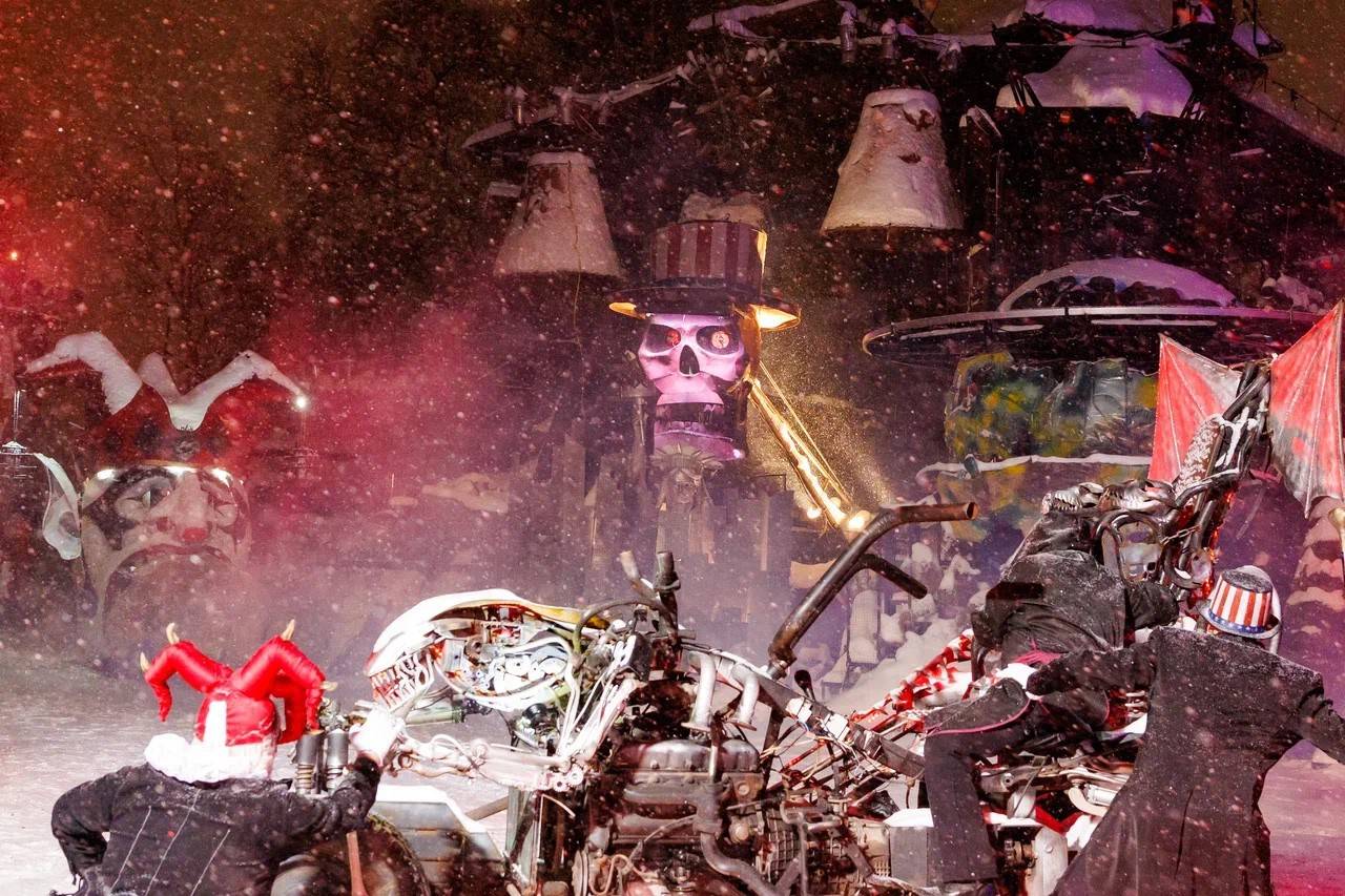 На сцене-открытой площадке - то ходит карлик, осматривается, где бы ещё зло сотворить, как бы напакостить, кровушки чьей бы попить. То череп в цилиндре, то чудо-юдо, моргающее адскими глазищами, то змей, нежданно вползший на русскую землю и разогнавший славно поработавший и веселящийся народ. Действуют в сказке персонажи как одушевлённые, так и «машины» - смастерённые умельцами-байкерами: железный Змей Горыныч, извергающий огонь, огромные загребущие лапы-клешни, крематорий пылает адским огнём, он тоже- действующее лицо. Русский Левша умел подковать блоху, русский байкер умеет оживить железо.