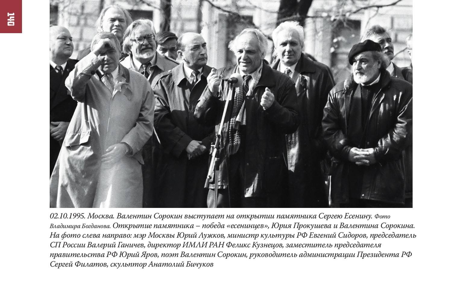 2 октября 1995 года. Разгул ельцинизма. Первая чеченская война. И – открытие в центре Москвы на Тверском бульваре памятника Сергею Есенину. Выступает поэт Валентин Сорокин (ни аудио, ни видео не сохранилось, есть только фото, спасибо фотографу Владимиру Богданову). Но к этому времени уже вышло первое издание «Креста поэта» и потому можно предположить, о чём говорил Валентин Васильевич. На авантитуле книги слова автора: «Сергей Есенин – воюющий поэт! Он стоит на рубежах великой русской культуры. Через его слово не проползет ни один нарушитель, ни один предатель. Трепетным светом он обнажит и покажет их лживое обличье своему народу».