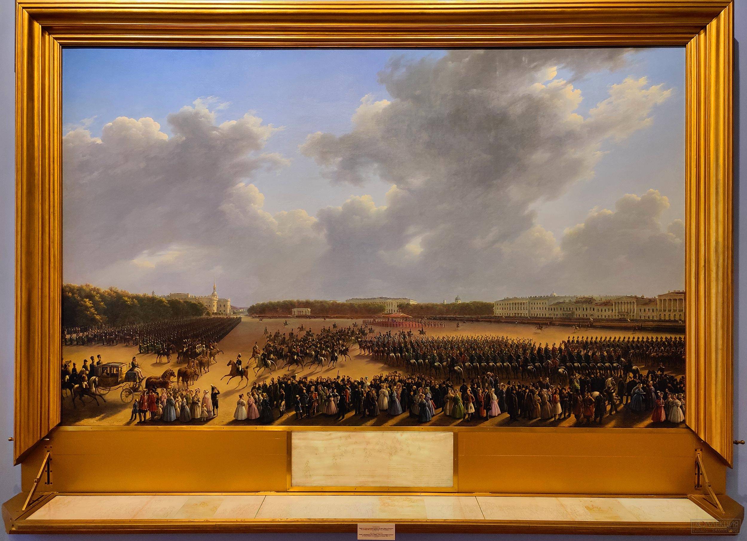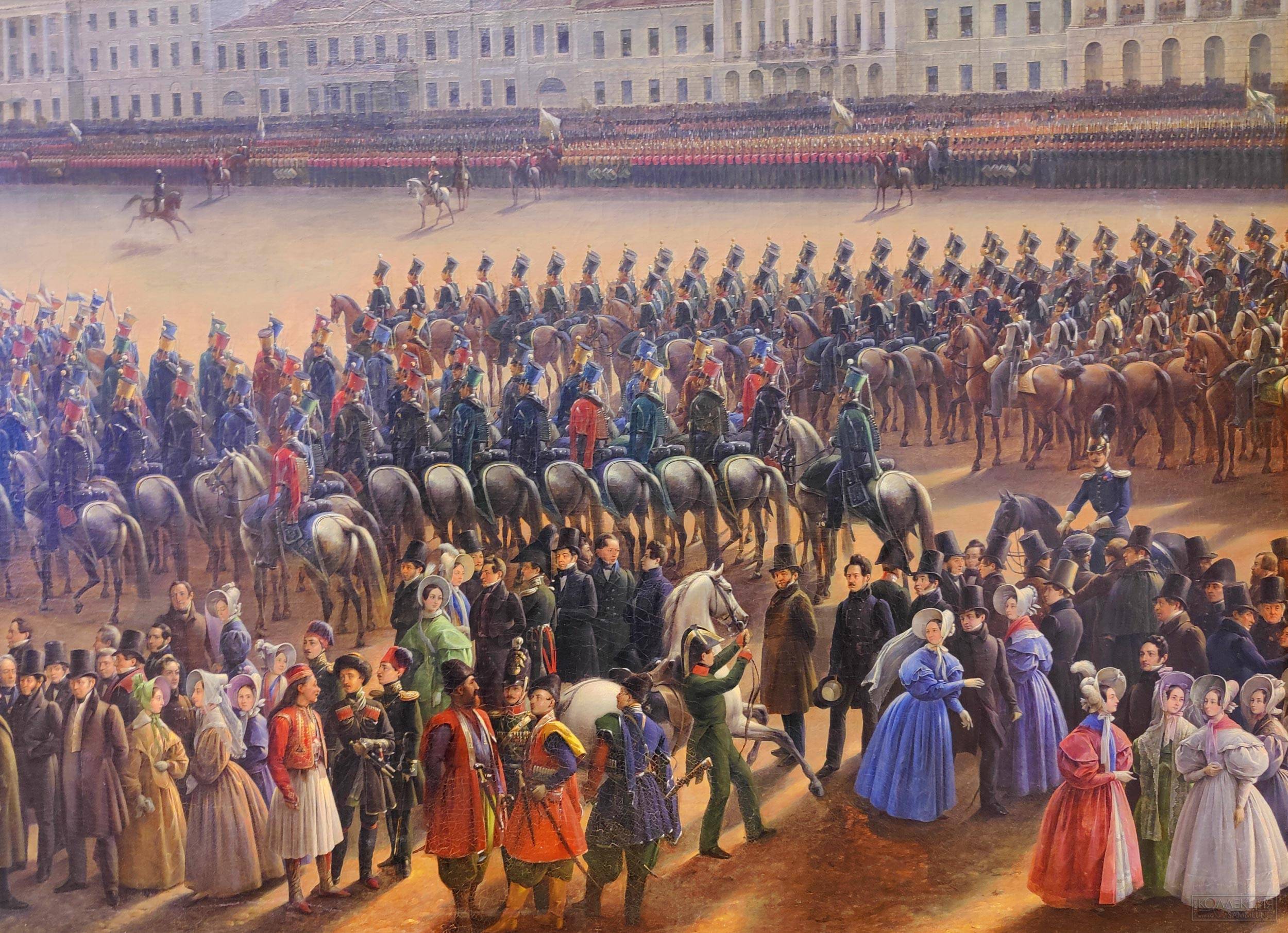 В экспозиции представлено роскошное полотно Григория Чернецова «Парад по случаю окончания военных действий в Царстве Польском 6-го октября 1831 года на Царицыном лугу», где художник проявил себя не только в качестве пейзажиста – здесь масса узнаваемых лиц, в том числе и сам венценосец. На гигантском групповом портрете - около трёхсот известных персон, что делает «Парад…» ценным документом. Список героев утверждал лично государь и, благодаря этому легко судить, кого император счёл важными и нужными людьми. Помимо знаменитостей, там есть купцы, крестьяне, и ремесленники – Николай всегда пёкся о народном единстве. Изначально от Чернецова требовался «…вид в ту меру, как писана картина Франца Крюгера „Парад в Берлине“». Наш мастер перещеголял немца и это отметили все созерцатели полотна.