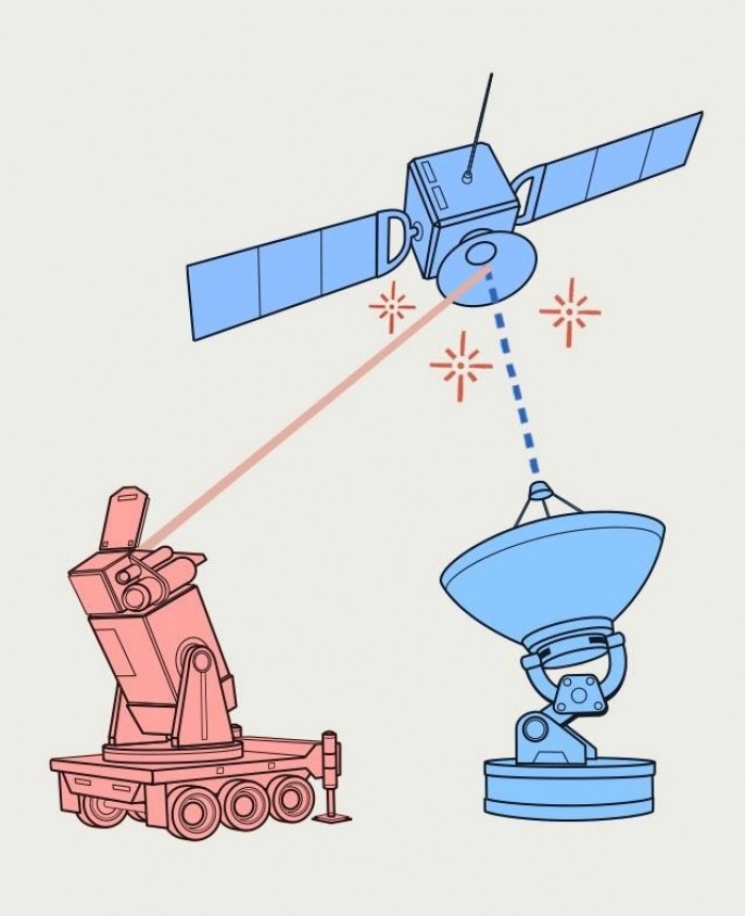 Оружие направленной энергии, такое как лазеры, может использоваться для временного ослепления или постоянного отключения датчика изображения спутника или потенциального повреждения его внутренних функций. Иллюстрация CNN