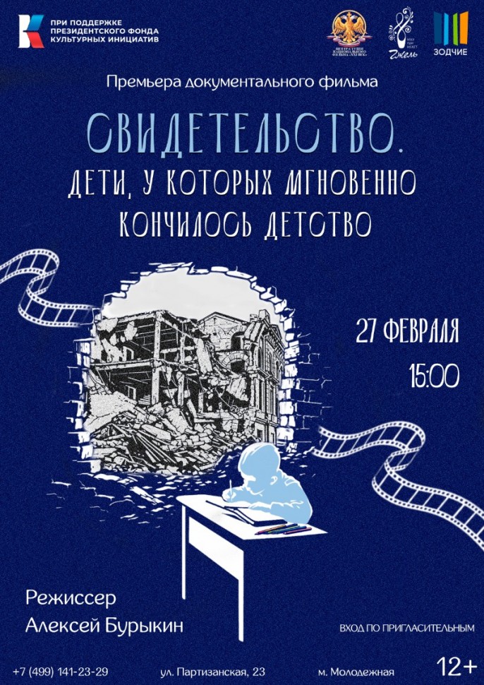 27 февраля в 15:00 в Культурном пространстве «Зодчие» (м. «Молодёжная», Партизанская ул., 23) состоится премьерный показ документального фильма «Свидетельство. Дети, у которых мгновенно кончилось детство…».