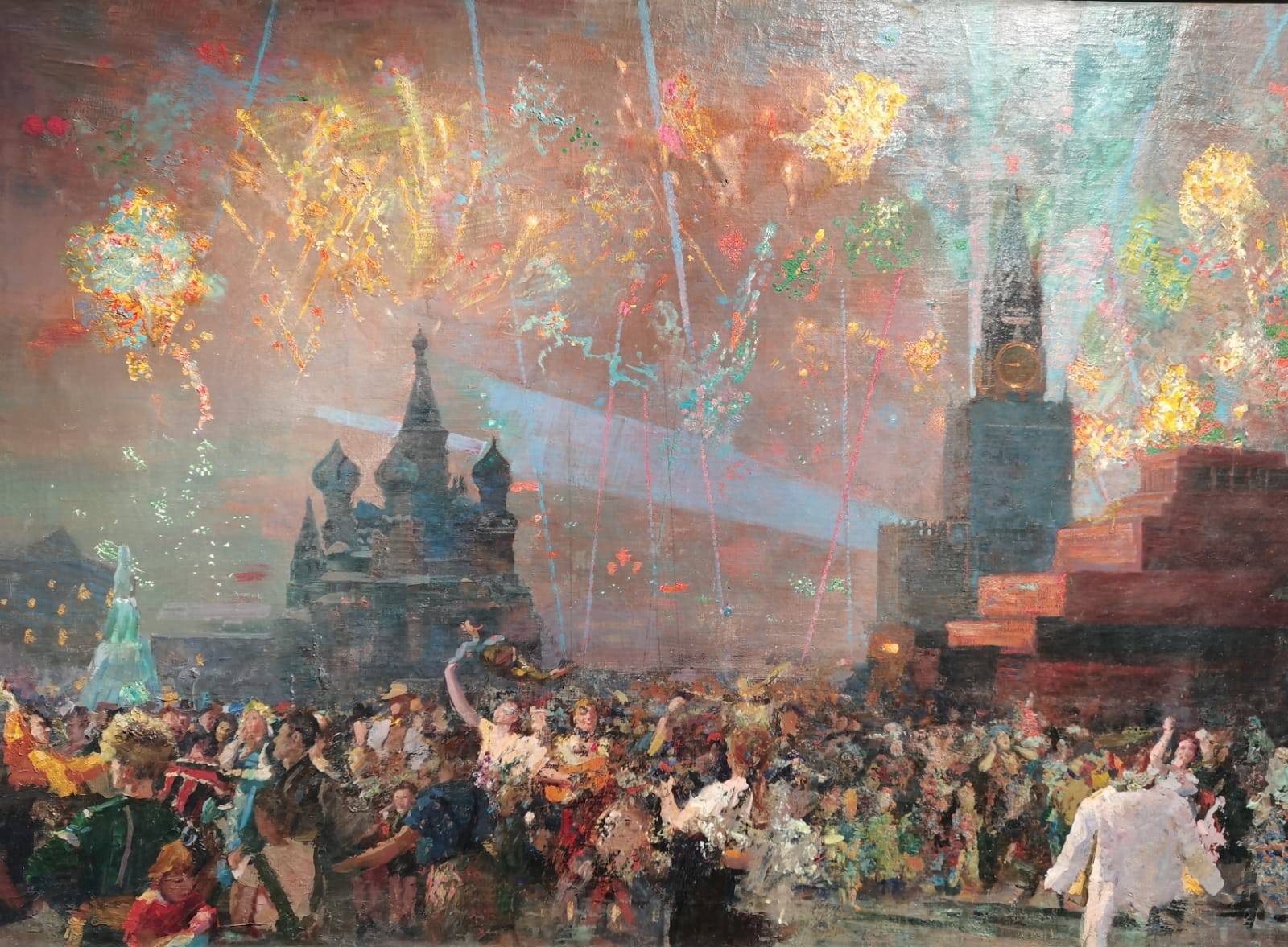 Москва-праздничная изображена Борисом Иогансоном на полотне «Салют победы». Красная площадь, освещённая тысячами разноцветных брызг и – ликующая толпа. Мы почти не различаем людей – все они кажутся частью единого целого. Яркие сполохи, бодрость чувств, энергия счастья. Реалист Иогансон добавил импрессионистские нотки, ибо это картина-впечатление. Мастер, живший во время войны в эвакуации, ещё в 1943-1944 годах замыслил эту фабулу – триумфальный фейерверк в день победы. Он даже делал эскизы – настолько была сильна вера в силу нашего оружия. Иогансон дождался! Увидев всё это воочию, художник тут же взялся за кисть, создав одно из лучших своих произведений.