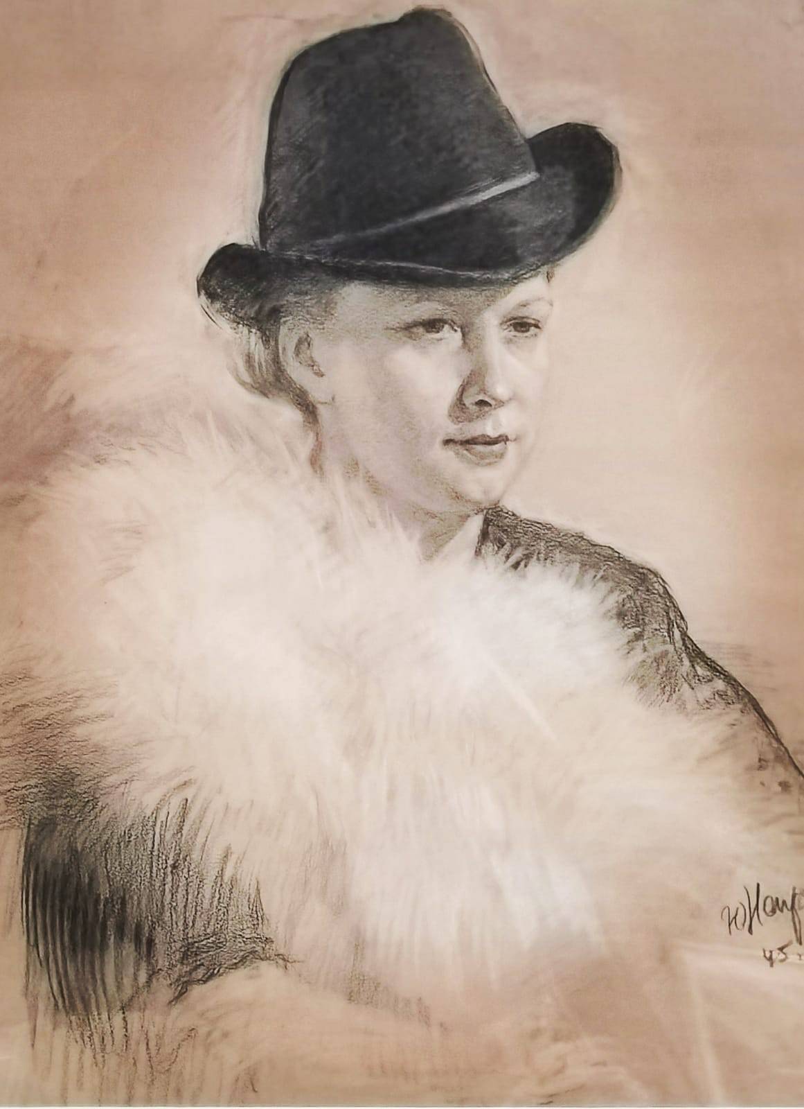 Чуть выше – портрет искусствоведа Марины Тихомировой, сделанный Юрием Непринцевым, хорошо известным зрителю по картине «Отдых после боя». Непринцев и сам воевал, совмещая путь воина со служением искусству. Героиня карандашного портрета величава – на ней модная шляпа и меховая горжетка, небрежно накинутая на плечо. Истинная леди. Кажется, что у этой дамы нет проблем – сплошные рауты, Ривьеры и кавалеры. Но! Собственно, Тихомирова – хранительница сокровищ Петергофа. Она пережила Блокаду и лишения, сумев сохранить притягательную женственность. Тихомирова держала спину ровно – под стать всем своим шляпкам с горжетками. На сопроводительной табличке даны её слова: у нас не было «мирных» профессий, во дни битвы всё подчиняется единому ритму, поэтому все – воевали, каждый на своём месте. После прорыва Блокады и вплоть до 1950-х годов Тихомирова участвовала в восстановлении разрушенных дворцов.