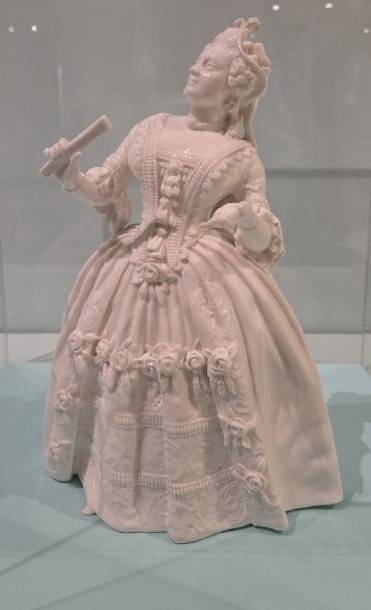 Вот и знаменитая статуэтка «Дама с маской», созданная по эскизу Константина Сомова. Пленительно-грациозная франтиха, кокетливо склонившая головку для поцелуя. Ах, благоухали розы Версаля, но, увы, и они оказались сметены бурями Французской революции. Фарфоровая пластика фиксирует игру тканей на юбке и то мимолетное движение, что подвластно не каждому художнику. Это - поэзия женщины-куклы в кружевах, рюшах и пудренном парике. Где тот ловелас, что заворожил сердечко финтифлюшки? Гильотина уравняла всех. Ещё одно фарфоровое чудо – «Екатерина II в маскарадном костюме». Фигурка, имевшая массовый выпуск, была создана на Императорском фарфоровом заводе.