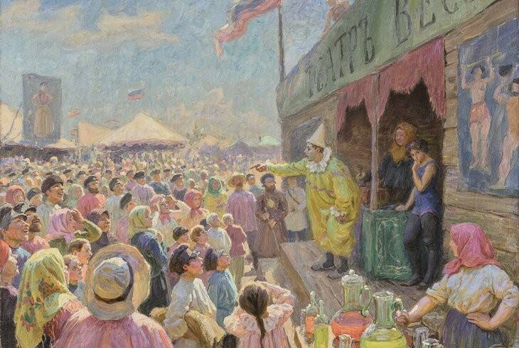После революции шло активное отрицание всего «барского» - от привычек и вкусов до эстетики. Бытовали полит-карнавалы, где пролетарии носили чучела Чемберлена и скандировали вирши, наспех сработанные синеблузниками. В 1930-х вернулись и дорические капители, и парки в духе Андре Ленотра, и кинофильмы о «хороших» царях. Пришлись ко двору и волшебные маскарады. На картине Бориса Тимина «Карнавал в парке культуры и отдыха» - всё те же маски – Пьеро, Арлекин, маркиза в платье на фижмах и некто в чёрном цилиндре – это уже не буржуй, но опереточный Мистер Икс. Фейерверк, фонарики, лодки, увитые цветами, и, если бы не алая звезда, присутствующая в оформлении, нам показалось бы, что это расслабляются какие-нибудь господа в поместье князей Голицыных. Советская власть сделала дворянские обычаи привилегией масс.