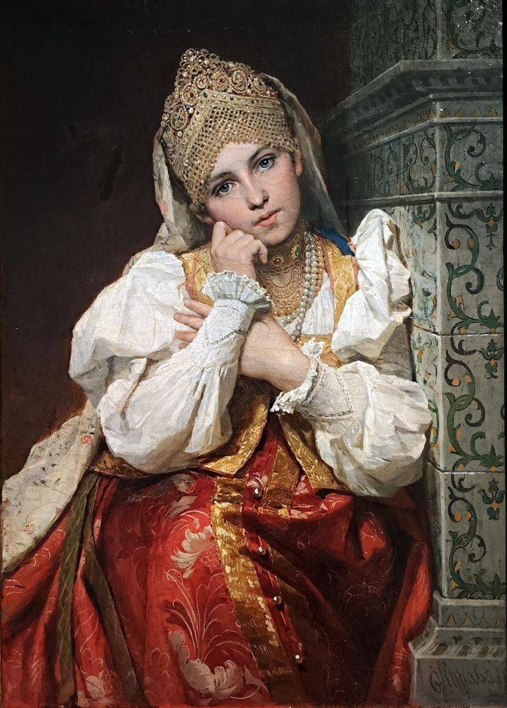 Иная точка сборки – допетровская Русь. Одно из направлений Ар-нуво – неорусский стиль течение с его пряничными башенками и новеллами «из боярской жизни». Хорошенькая «Боярышня» Фирса Журавлёва – это сказочная реальность, помноженная на фантазии мастера. Открыточная дева Серебряного века с лицом гимназистки-старшеклассницы – дань всеобщей моде на кокошники да мониста. Терема, купола, опричники с тонкими станами, царевичи в парчовых кафтанах – этого было столь много в искусстве, что над декоративной русскостью посмеивалась образованная публика. Не существовало понятия «клюква», но бытовали сатирические рассказики о романистах, употребляющих словеса «инда», «зело» и «понеже».