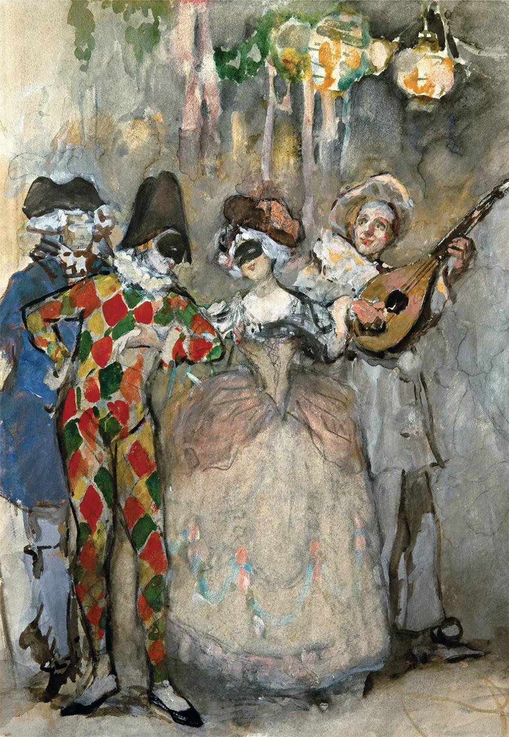 Чуть поодаль – затейливый рисунок Анны Ремизовой-Васильевой «Придворная дама на маскараде». Капризница благосклонно принимает ухаживания коленопреклонённого Пьеро. Это лестно – слушать лирику эмоций, однако, на лице чаровницы написана скука. Пьеро – это печаль, а жаждется беспрестанных развлечений и острых моментов. Где-то там, за колонной, ожидает коварный виконт де Вальмон – вот это приключение! «Маскарад» Николая Сапунова – это типичная сценка, где шаловливая девушка выбирает Арлекина и отворачивается от Пьеро. Картина – сочна и красочна. Огни фейерверков и таинственный свет китайских фонариков – в такой атмосфере хочется забыть о повседневности и предаться флирту.
