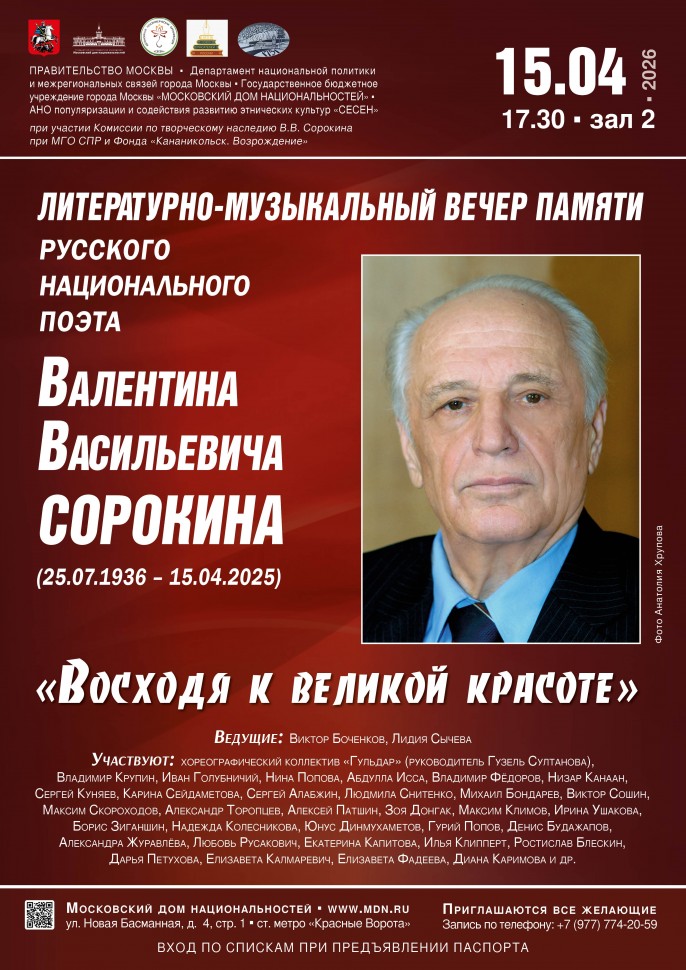 В Московском доме национальностей (ул. Новая Басманная, д.4, стр.1, метро «Красные Ворота») 15 апреля (среда) в 17.30 АНО популяризации и содействия развитию этнических культур «СЕСЕН» при участии Комиссии по творческому наследию В.В. Сорокина при МГО СПР и Фонда «Кананикольск. Возрождение» проведут литературно-музыкальный вечер «Восходя к великой красоте», посвященный памяти русского национального поэта Валентина Васильевича Сорокина (25.07.1936–15.04.2025).