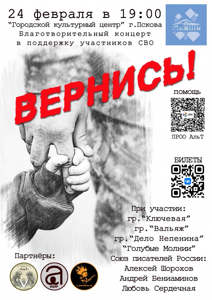 24 февраля в 19 часов в Городском Культурном Центре г. Псков пройдёт Благотворительный рок-концерт, приуроченный к началу Специальной Военной Операции.