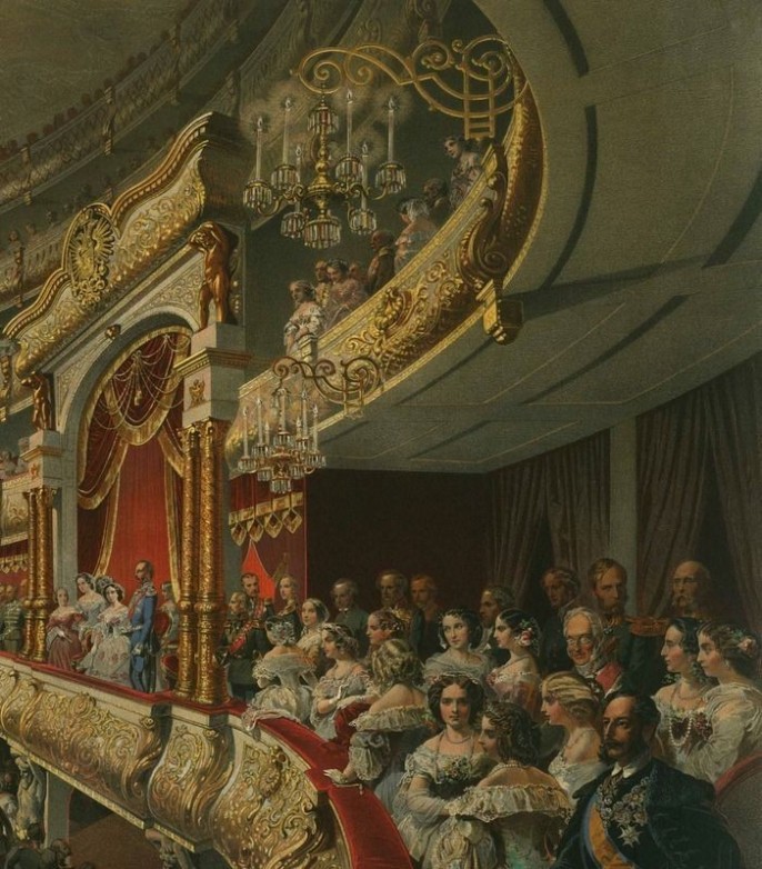 Рис. Михаил Зичи. Открытие восстановленного после пожара Большого театра в присутствии императора Александра II, 1856 год.