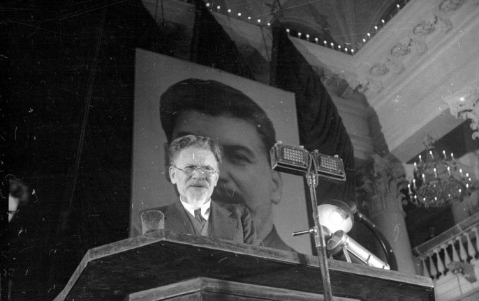 Илл. М.И. Калинин выступает в Колонном зале Дома Союзов на вечере, посвящённом 20-летию завода №8 имени М.И. Калинина, 17 января 1939 года