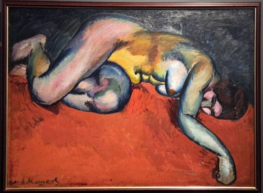 Кто полностью отдавался течениям, так это Илья Машков – талантливейший рубаха-парень. Александр Бенуа констатировал: «Машков - образец живой творческой силы, темперамента, непосредственности». Портрет Варвары Виноградовой написан свежо и мощно. С одной стороны, это – репрезентативный портрет городской львицы, а с другой – лубок и шутка. Не менее ошеломляющ портрет Евгении Киркальди – купеческой дочери, занимавшейся в студии Машкова. Рыжая дама в синей накидке – сочность и колористическое безумство. Машков удивлял и – раздражал своими сине-зелёными натурщицами, которых также мы наблюдаем в экспозиции. Главное, что он никогда не изменял хорошему вкусу – в сумасбродстве Машкова прослеживается чёткость отменного рисовальщика.