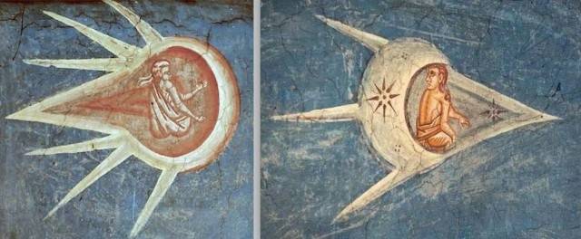 Главное, что наши гипотетические НЛО в действительности размещены на фреске именно там, где должны были по сложившейся иконографической традиции оказаться Солнце и Луна. «Объекты» выглядят как диски, у левого лучи в полном соответствии с евангельскими словами о померкшем Солнце отклоняются в сторону от креста, а Луна выглядит явно как полумесяц. То, что они наделены антропоморфными чертами, тоже не удивительно. Фигура слева явно мужская, а справа, насколько можно разобрать по фото, женская. Но сходным образом их представляют на множестве других изображений, как более ранних, так и более поздних». [3]