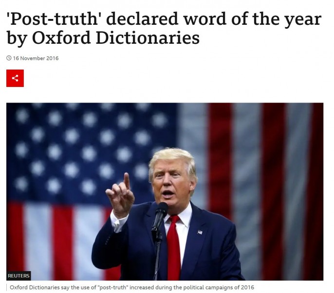 Чтобы лучше понять ситуацию в обществе и медиа в частности: в 2016 словом года стала «постправда» (это когда правда у каждого своя), а в 2017 — «фейк-ньюс».