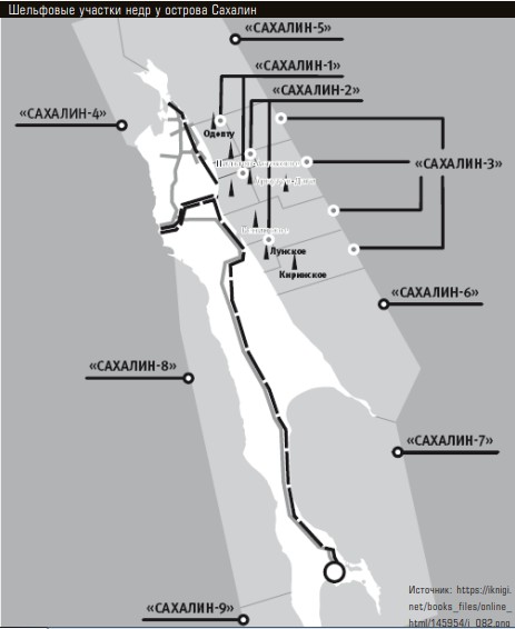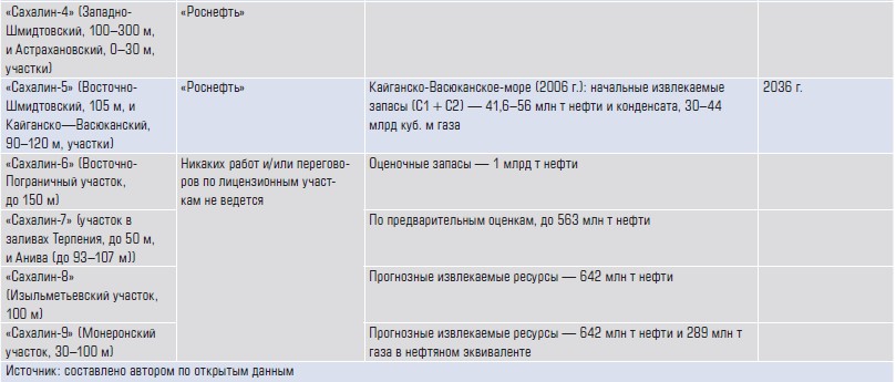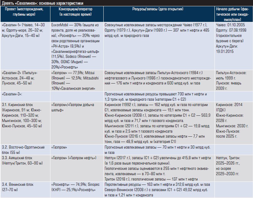 В 1991 году Российская Федерация провела первый конкурс среди иностранных фирм на освоение углеводородных ресурсов недр сахалинского шельфа. По его итогам в 1994 году было подписано соглашение о разделе продукции (СРП) с консорциумом инофирм по проекту «Сахалин-2», а спустя год — с другим консорциумом по проекту «Сахалин-1» и также на условиях СРП. В 1996-м, после принятия и вступления в силу Федерального закона «О соглашениях о разделе продукции», оба этих проекта с иностранным участием и соглашения по ним вступили в силу. Всего же в программу лицензирования участков недр сахалинского шельфа для конкурсного предоставления их в пользование было включено девять участков, получивших порядковые номера от 1 до 9. Так в обиход вошло понятие «девять “Сахалинов”». В силу разных причин сегодня добыча ведется только на вышеназванных двух лицензионных участках. Еще на трех («Сахалин-3», куда входят четыре блока, «Сахалин-4» и «Сахалин-5») имеются недропользователи, уже только российские, и ведутся работы. Где-то открыты месторождения и есть заявленные сроки их ожидаемого ввода в эксплуатацию. На четырех участках («Сахалин 6–9») никаких работ и/или переговоров по лицензионным участкам не ведется (см. таблицу).