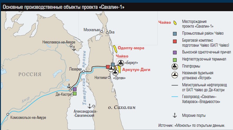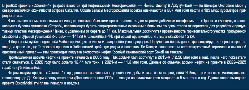 «Сахалин-1». В марте 2022 года, во исполнение антироссийских санкций, введенных после начала СВО группой западных государств, компания — оператор проекта СРП «Сахалин-1» Exxon Neftegaz Ltd., «дочка» американской ExxonMobil, заявила о намерении выйти из проекта, а в апреле — о введении режима форсмажора, в результате чего работа проекта была практически остановлена. В ответ на эти недружественные действия и для устранения рисков операционной деятельности при сохранении регистрации компании — оператора проекта в зарубежной юрисдикции (до октября 2022 года компания Exxon Neftegaz Ltd. была зарегистрирована на Багамских островах) президент России Владимир Путин издал указ, в соответствии с которым учреждается российский оператор проекта ООО «Сахалин-1», которому переходят все права и обязанности инвесторов — членов-консорциума, включая функции оператора проекта, с сохранением структуры акционеров при их согласии на перерегистрацию своих долей в российскую юрисдикцию. Двадцать процентов во вновь учрежденной компании получили «дочки» «Роснефти» — «РН-Астра» и «Сахалинморнефтегаз-шельф» (последняя стала фактическим оператором проекта), оставшиеся 80% были зарезервированы для иностранных участников СРП. Свое согласие на получение пропорциональной доли в новом операторе дали участники консорциума японская Sodeco (30%) и индийская ONGC (20%). ExxonMobil заявила, что прекращает участие в проекте и полностью уходит из России. Принадлежащая ExxonMobil доля в 30% перешла российскому государству и будет продана российскому акционеру. Эта доля до сих пор остается невостребованной — по указу президента она может быть продана только российскому юридическому лицу. Установленный срок продажи постоянно переносился, в декабре 2024-го президент своим указом продлил его до 1 января 2026 года. Однако в августе 2025-го, за несколько часов до встречи Владимира Путина и президента США Дональда Трампа в Анкоридже, президент России подписал указ, дающий возможность, при выполнении ряда условий, возобновления работы ExxonMobil в «Сахалине-1». Этот «жест доброй воли» остался безответным. 18 сентября генеральный директор ExxonMobil Даррен Вудс в интервью Financial Times заявил об отсутствии у корпорации намерений вернуться к участию в проекте «Сахалин-1». По его словам, компания ведет переговоры с российской стороной лишь о компенсации принадлежавших ей активов в размере 4,6 млрд долларов. ExxonMobil считает эту утрату активов экспроприацией и инициировала международный арбитраж против России о возмещении ей этой суммы. Но параллельно с арбитражем американская компания не оставляет попыток договориться с российской стороной. По сообщению агентства Reuters, в конце августа — начале сентября 2025 года ExxonMobil и «Роснефть» заключили необязывающее соглашение, которое задает рамки для обсуждения компенсации 4,6 млрд долларов, списанных Exxon в убытки после ухода из России, и потери доли в проекте. По данным агентства, документ лишь фиксирует намерение сторон продолжить диалог. Срок действия СРП «Сахалин-1» — до 2055 года.