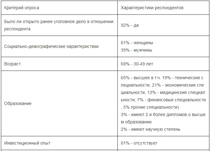 Таким образом, анализируя представленные данные, можно составить краткий портрет стандартного вкладчика в финансовую пирамиду: это женщина (реже мужчина), в возрасте от 30 до 49 лет, имеющая высшее (возможно даже экономическое или финансовое) образование, без опыта инвестирования, в прошлом имеющая открытое уголовное дело. Представитель данной возрастной группы относится к числу миллениалов (поколение Y), родившихся во времена СССР. «Дети-миллениалы» застали перестройку, а их взросление пришлось на девяностые годы. Они более склонны к импульсивным покупкам и склонны вкладывать деньги для дальнейшего их сбережения и приумножения. Также в различных источниках отмечается, что поколение Y использует микрозаймы как один из ходовых финансовых инструментов, стараясь найти «свою» микрофинансовую организацию для регулярного и более выгодного сотрудничества. Вместе с тем, именно микрофинансовые организации являются наиболее распространёнными субъектами, осуществляющими незаконную финансовую деятельность.