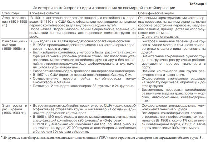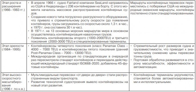 В зависимости от особенностей развития контейнерных перевозок в разные периоды, его можно условно разделить на пять периодов: зарождения (эмбриональный), инновационный, роста и расширения, зрелости и, наконец, этап высокоскоростного масштабирования. Коротко охарактеризуем каждый из этапов (таблица 1).