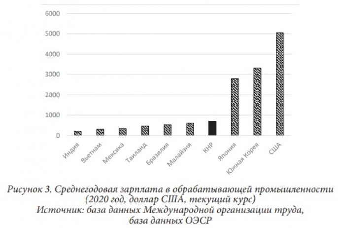 Хотя контейнерные перевозки в КНР начались лишь в конце 70-х годов XX века, в период 2005–2015 годов среднегодовые темпы контейнеризации китайских портов уже превышали 35%. Так, в 2010 году Шанхай становится крупнейшим контейнерным портом мира, в 2011 году в Топ-10 мировых портов входит 6 китайских. В 2023 году из 10 крупнейших контейнерных портов мира 7 находились на территории КНР. Еще одной причиной переноса контейнерной отрасли в ту или иную страну стало наличие дешевой рабочей силы или «демографического дивиденда» Многие азиатские страны прошли в демографической политике схожие пути. С 1962 года до середины 1990-х годов РК проводила кампанию по ограничению рождаемости, что соответствовало целям по достижению экономического благосостояния. По данным ООН, в 1958 году уровень фертильности женщин РК составлял 6,3, в 1970 году — 4,3, в 1983 году опустился ниже 2,1. Последние данные Statistics Korea показали, что уровень рождаемости в стране в 2023 году снизился до исторического минимума в 0,72 (самый низкий уровень рождаемости в мире). Показатель четвертого квартала 2023 года и вовсе опустился до 0,65 (самое низкое значение с 2009 года). Пока население было избыточным и заработная плата не слишком высокой, выпуск контейнеров было целесообразно осуществлять в Южной Корее. С конца 1980-х годов заработная плата в РК значительно выросла, например за 3 года с 1987 по 1990 год более чем на 80%. Рост стоимости рабочей силы (рисунок 3) привел к масштабному переносу трудоемких производств в развивающиеся страны и прежде всего в КНР.