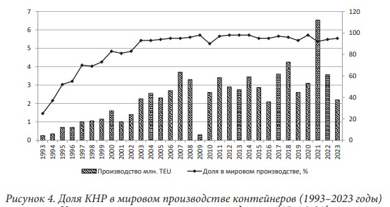 Контейнеризация — это транспортный метод доставки грузов, который предполагает использование стандартизированных контейнеров для транспортировки товаров различными видами транспорта (морским, железнодорожным, автомобильным и отчасти авиационным). Контейнеризация является наиболее динамичным физическим компонентом глобализации, намного превышающим рост стоимости экспорта и ВВП. В период с 1980 по 2020 год мировой контейнерооборот увеличился в 20 раз, а мировой экспорт и ВВП — в 8,9 и 7,5 раза соответственно. Сегодня контейнерные перевозки распространились по всему миру, а уровень контейнеризации перевозок генеральных грузов среди развитых стран превышает 80%. Глобальная контейнерная торговля стала стремительно развиваться с начала 2000-х годов: объем контейнерной торговли вырос с 600 млн т до 1,86 млрд т в период 2000–2023 годов. Если в 2000 году ежегодно мировой контейнерооборот составлял 65 млн TEU, то в 2023 году более 200 млн TEU перевозилось на 6000 контейнеровозах. Из вышепреведенных данных мы видим, что за последние 45–50 лет контейнер превратился в важное и удобное «орудие» транспортировки грузов. По всей видимости, производство и торговля этой тарой крайне актуальна и привлекательна. Как бы ни были привлекательны контейнеры, но пока они не попали в китайские руки, всемирной контейнеризации не произошло. Какие причины привели к монополизации Китаем выпуска контейнеров?