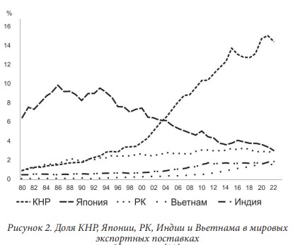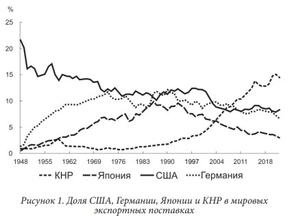 В 2010 году доля Китая в мировом экспорте увеличилась до 10%. Исторически существовало только три страны, экспорт которых составлял более 10% мировой доли: США, Германия и Япония. Пик в США когда-то превышал 20%, главным образом в период после окончания Второй мировой войны, и упал ниже 10% после 2000 года. В настоящее время доля КНР в мировом экспорте составляет порядка 14–15%. Как мы видим из данных, приведенных на рисунках 1 и 2, пока у КНР нет реальных конкурентов на мировом экспортном рынке.