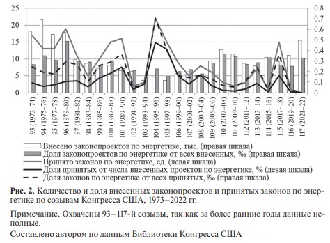 Собранные за много лет эмпирические данные показывают, что при республиканском большинстве в Конгрессе принимается больше законов по энергетической тематике, чем при большинстве у демократов. Так, демократы контролировали 44% созывов Конгресса (93–96, 100–103, 107, 110–111), а республиканцы – 40% (97–99, 104–106, 108–109, 114–115) (рис. 2). В остальных 16% случаев партии контролировали по одной из палат. На 104‑й “республиканский” созыв пришелся исторический максимум принятых законов по энергетике.