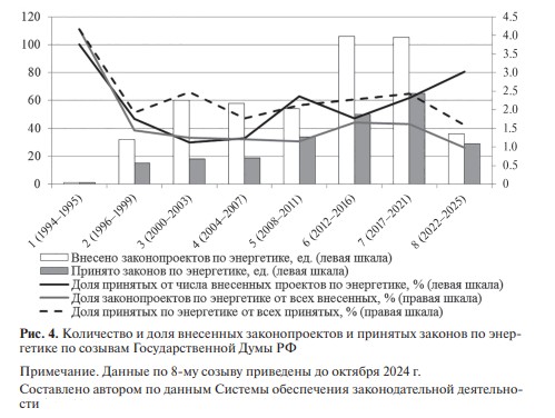 В частности, наблюдается (рис. 4) рост количества вносимых законопроектов и принимаемых законов по энергетике (эти параметры коррелируют с коэффициентом 0.9 при р меньше 0,01. Доля внесенных законопроектов и доля принятых законов по энергетической тематике имеют почти линейную зависимость (0.95).