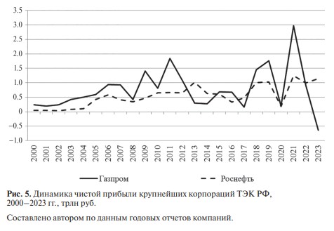 Лоббистские расходы российских компаний не могут быть достоверно оценены, но есть данные о финансовых вливаниях “Газпрома” в проекты “Единой России” и отдельных членов этой партии. В частности, в 2018–2019 гг. “Газпром” пожертвовал 150 млн руб. на строительство жилых домов в п. Елшанка Саратовской области, что освещалось как благотворительный проект В. Володина. В первый год после принятия обсуждаемого закона выручка “Газпрома” возросла на 62%, прибыль – в 4 раза, активы – на 15.4%, поставки на внутреннем рынке – на 11.2%, догазификация была завершена на 22.7% больше домовладений, а количество подключенных хозяйств выросло в 6.2 раза. В динамике пиковые значения прибыли “Газпрома” значительно выше, чем у конкурента – “Роснефти”, а минимумы более сглаженные (кроме 2023 г.), что указывает на демпфирующий эффект от государственной поддержки газового монополиста (рис. 5).