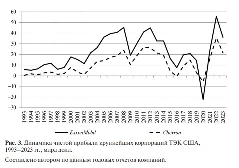 Несмотря на “зеленую” повестку администрации Байдена и 117‑го Конгресса, чистая прибыль топливно-энергетических компаний в 2021–2022 гг. увеличилась (например, у ExxonMobil в 2.4 раза – с 23 млрд до 55.8 млрд долл.). Это было связано с ростом добычи нефти и открытием крупнейшего нефтеперерабатывающего завода “Бомонт”. Возросла также и прибыль конкурента ExxonMobil – компании Chevron. Представляется, что именно законодательные изменения положительно повлияли на основных игроков нефтегазового рынка США (рис. 3). Представленные цифры доказывают влиятельность отраслевого лобби, способного блокировать (в случае законопроекта HR5376) или существенно смягчить (проект HR3684) нежелательные для себя инициативы, невзирая на их высокий политический статус (рассмотренные законопроекты были направлены на реализацию предвыборной программы президента США).