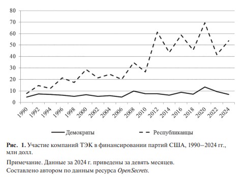 Есть и еще один закон, который ограничивает работу бывших чиновников в качестве корпоративных лоббистов. Но и он исполняется не полностью: до половины экс-конгрессменов вовлечено в практику “вращающихся дверей”. Топливно-энергетические корпорации активно участвуют в политической жизни. Они имеют штатных лоббистов в Конгрессе и тратят на лоббизм крупные суммы. В 2023 г. компании нефтегазовой отрасли истратили на него 133 млн долл. и стали лидерами по этому показателю. Среди 500 наиболее прибыльных нефтегазовых компаний более 200 имеют доказанные связи с политиками. О тесных связях ТЭК с Республиканской партией говорят и размеры их пожертвований в ее пользу (рис. 1).