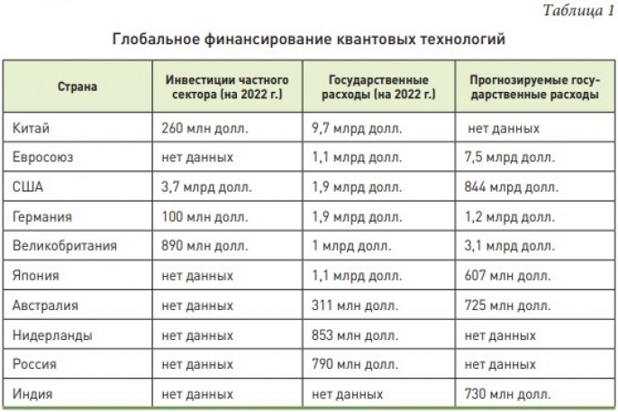 В настоящее время глобальные квантовые усилия способствуют активным исследованиям и инновациям в области квантовой науки и технологий, при этом текущие мировые инвестиции уже превышают 38,6 млрд долл. Прогнозируется, что к 2040 г. мировой рынок квантовых технологий достигнет уровня 106 млрд долл. Глобальное финансирование квантовых технологий на 2022 г. представлено в таблице 1.