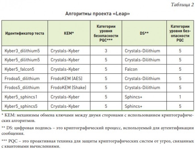 В связи с чем в проекте «Leap» одной из основных задач была реализация выбранных алгоритмов и понимание последствий перехода на новые криптографические стандарты. В ходе проекта были протестированы не только алгоритмы, выбранные для международной стандартизации, но и алгоритм FrodoKEM, который эксперты по кибербезопасности из Banque de France и Deutsche Bundesbank считают столь же надежным, как и другие алгоритмы (табл. 3).
