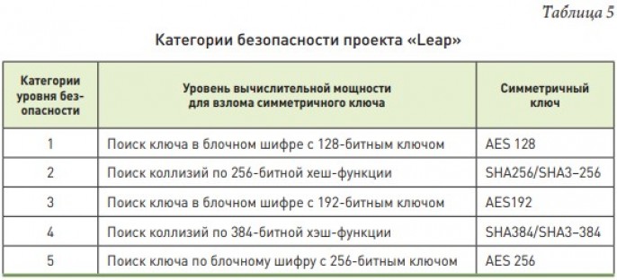 Безопасность. Команда проекта «Leap» протестировала несколько различных категорий безопасности, проведя сравнительный анализ гибридных и негибридных режимов. Криптографические алгоритмы обеспечивают различную степень безопасности в зависимости от используемого алгоритма и размера ключа. Категории уровня безопасности (табл. 5) постквантового алгоритма определялись в диапазоне от 1 до 5 (5 – наиболее безопасный), и базировались на стандартах симметричной криптографии.