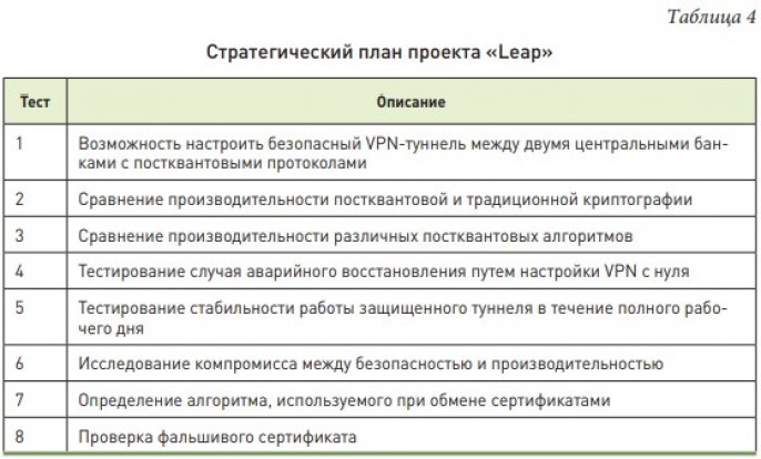 Криптографические алгоритмы часто основаны на определенных классификационных критериях математических задач. Три из четырех алгоритмов, выбранных для международной стандартизации, относятся к семейству задач на основе решеток, один – к семейству задач на основе хеширования (табл. 3). Важной целью данного процесса было использование разнообразного набора семейств математических задач в качестве основы для алгоритмов. Это связано с тем, что хотя сегодня один алгоритм можно считать достаточно надежным для защиты IT-систем, неясно, будет ли это так в долгосрочной перспективе, поскольку киберугрозы быстро развиваются. Далее, на очередном этапе проекта «Leap», после настройки многоуровневого VPN-туннеля было проведено тестирование различных этапов нового протокола с гибридизацией. Фактически, при настройке классической VPN, первым делом происходит обмен ключами, далее передаются сертификаты на проверку. Клиент создает симметричный ключ, зашифрованный открытым ключом. Затем симметричный ключ расшифровывается с помощью закрытого ключа на стороне сервера. Этот протокол, широко используемый в настоящее время, – гораздо проще, чем новая гибридная настройка VPN, содержащая в себе дополнительные шаги, поскольку классические алгоритмы используются наряду с постквантовыми. Для проверки того, как установка безопасного туннеля с постквантовыми криптографическими протоколами в гибридном режиме обеспечит полнофункциональное решение в контексте двух отдельных объектов и разных IT-сред, был сформирован стратегический план (табл. 4) с целью проведения последовательных испытаний.