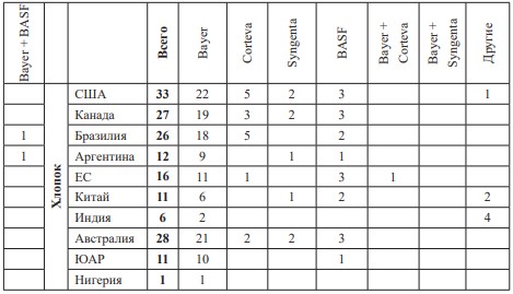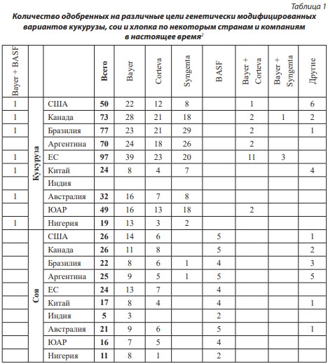 В таблице 1 представлены сводные данные по количеству одобренных вариантов ГМ кукурузы, сои и хлопка в отдельных регионах мира до сегодняшнего дня. Во всех них, кроме ЕС, в той или иной степени разрешено производство и коммерческий оборот ГМ растениеводческой продукции. В таблице представлены данные по всем видам одобрения без спецификации конкретного из них: для использования в кормовых или пищевых целях в первоначальном или переработанном виде, либо для выращивания с целью внутреннего потребления или экспорта. Наличие такого одобрения означает, как минимум, возможность импорта соответствующей продукции на внутренний рынок, но необязательно дает право выращивания такой культуры в стране. Последнее хорошо видно на примере ЕС. Если брать основные рынки на примере указанных стран, то от 80 до 100% ГМ типов кукурузы, сои и хлопка разработано в той или иной форме всего четырьмя корпорациями в их сегодняшней структуре – Bayer, Corteva, Syngenta и BASF. Из них в большинстве случаев основную долю занимают разработки Bayer (ранее – Monsanto). Здесь мы учитываем все связанные с этими корпорациями компании и совместные предприятия с их участием. Как уже было отмечено, крупнейшие корпорации часто вступают в совместные проекты и коммерциализируют общие разработки.